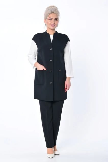 Удлиненный жилет прямого силуэта, на подкладке. Выполнен из плотной костюмно-плательной ткани. По переду вытачки, накладные карманы, центральная застежка на петли и пуговицы. По спинке вытачки, средний шов, удлиненная шлица с застежкой на пели и пуговицы.