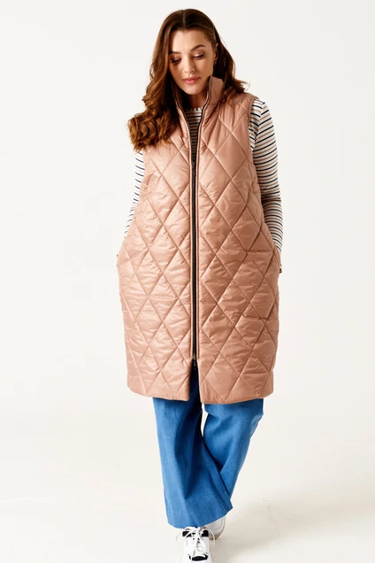 Жилет женский, свободного силуэта, из стеганной ткани, на синтепоне. Застежкой на тесьму молнию. В боковых швах прорезные карманы. Воротник стойка. Жилет на подкладке. Длина 100 см.