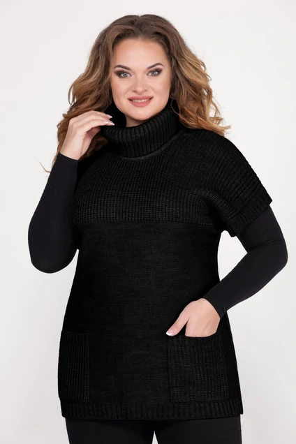 Жилет женский, удлинённый, прямого силуэта. Горловина круглой формы с воротником "сдвоенная стойка". Роймы изделия обработаны прикетлёванной бейкой. По переду изделия расположены карманы. Основное переплетение жилета - гладь, низ изделия, проймы-резинкой. Длина изделия - 68см. Длина рукава от горловины- 27см, ширина рукава- 50см.