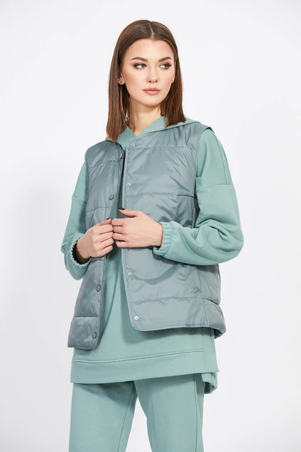 Жилет выполнен из плащевой ткани, простеганной с холлофайбером. Жилет полуприлегающего силуэта, длиной выше линии бедер. Застежка спереди на пробивные кнопки. Спинка цельная. Карманы в боковых рельефах. Горловина округлой формы, трансформируемая в V-образную форму при помощи кнопок. Низ края борта округлой формы. Горловина, край борта, низ и проймы обработаны окантовкой из основной ткани. Жилет на подкладке из основной ткани.