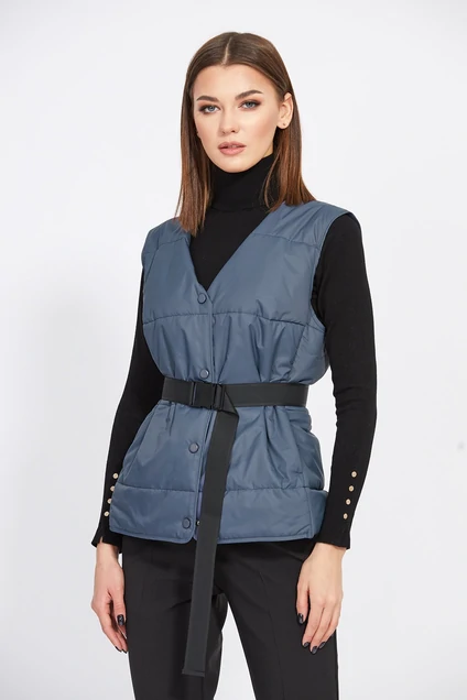 Жилет выполнен из плащевой ткани, простеганной с холлофайбером. Жилет полуприлегающего силуэта, длиной выше линии бедер. Застежка спереди на пробивные кнопки. Спинка цельная. Карманы в боковых рельефах. Горловина округлой формы, трансформируемая в V-образную форму при помощи кнопок. Низ края борта округлой формы. Горловина, край борта, низ и проймы обработаны окантовкой из основной ткани. Жилет на подкладке из основной ткани.