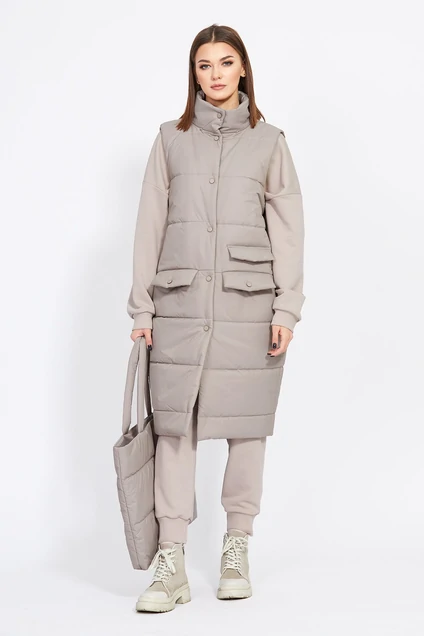 Жилет выполнен из плащевой ткани, простеганной с холлофайбером. Жилет О-образного силуэта, длиной до линии колена. Застежка спереди на пробивные кнопки. Спереди подрезы по линии талии, в швах подрезов карманы с клапанами с декоративными кнопками, декоративный клапан слева. Спинка со средним швом. Воротник-стойка со съемным капюшоном, застегивающимся на пробивные кнопки. Жилет на притачной по низу подкладке. ВНИМАНИЕ! могут быть без декоративных нашивок по спинке.