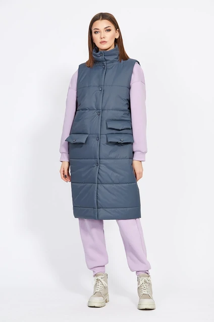 Жилет выполнен из плащевой ткани, простеганной с холлофайбером. Жилет О-образного силуэта, длиной до линии колена. Застежка спереди на пробивные кнопки. Спереди подрезы по линии талии, в швах подрезов карманы с клапанами с декоративными кнопками, декоративный клапан слева. Спинка со средним швом. Воротник-стойка со съемным капюшоном, застегивающимся на пробивные кнопки. Жилет на притачной по низу подкладке. ВНИМАНИЕ! могут быть без декоративных нашивок по спинке.
