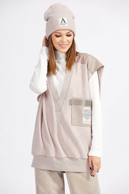 Жилет выполнен из трикотажного полотна в рубчик. Жилет прямого силуэта, длиной ниже линии бедер. Вырез V-образной формы, обработан бейкой из довяза. Цельнокроенная кокетка переда и спинки выполнена из экокожи. Спереди накладной карман из экокожи. Плечевой шов спущен. Низ жилета на притачной манжете из довяза. Жилет декорирован настрочной тесьмой и нашивкой по карману.