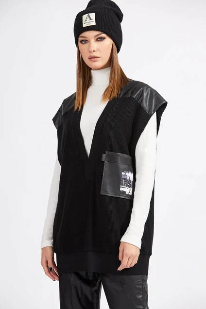 Жилет выполнен из трикотажного полотна в рубчик. Жилет прямого силуэта, длиной ниже линии бедер. Вырез V-образной формы, обработан бейкой из довяза. Цельнокроенная кокетка переда и спинки выполнена из экокожи. Спереди накладной карман из экокожи. Плечевой шов спущен. Низ жилета на притачной манжете из довяза. Жилет декорирован настрочной тесьмой и нашивкой по карману.