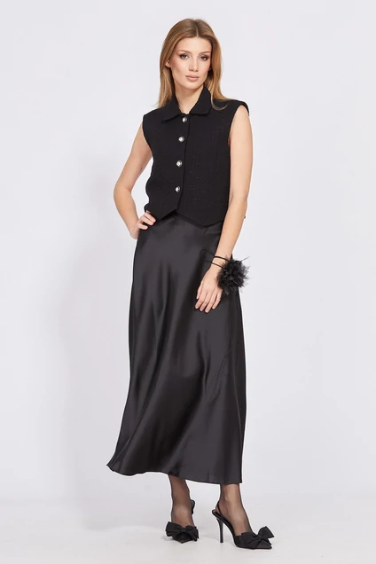 Жилет выполнен из твида. Жилет прямого силуэта, длиной чуть ниже талии, с фигурным низом спереди. Застежка спереди центральная бортовая на пуговицы. Спинка цельная. Вортоник пиджачного типа.