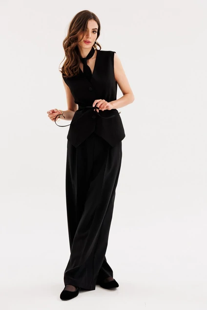 Жилет выполнен из костюмной ткани. Жилет полуприлегающего силуэта, длиной до линии бедер. Низ жилета фигурной формы. Спереди декоративные карманы и центральная застежка на пуговицы. Горловина переда V-образной формы. Жилет на притачной по низу подкладке. В комплект входит пояс-шнур из основной ткани.