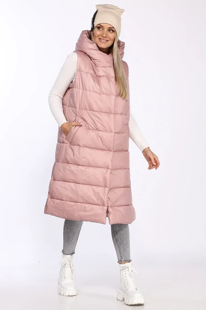 Жилет утеплённый, прямой, с капюшоном, длиной ниже колена. Жилет с горизонтальными широкими строчками. Наклонными боковыми карманами- листочка с втачными концами. Жилет с боковыми разрезами - шлицами выше колена. Капюшон большой ,состоит из трёх частей и широкой планки. Застежка жилета на 4 пришивные прозрачные кнопки.