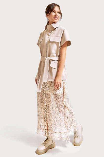 Жилет свободного силуэта, застегивается на молнию и планку с кнопками, рукава цельнокроеные. По переду жилета накладные и прорезные карманы. В комплекте съемный пояс.