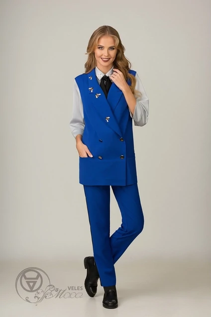 Двубортный жилет прямого силуэта на подкладке из костюмной ткани. По переду и спинке вертикальные подрезы. В горизонтальном подрезе переда расположен карман-листочка. Жилет с центральной застежкой на 4 петли и 4 пуговицы. Воротник с лацканом стояче-отложной. По воротнику проложены отделочные детали «пчелки», придающие изделию особую уникальность.