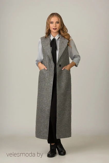 Жилет длинный из пальтовой ткани на подкладке прямого силуэта. По переду и спинке рельефы, идущие в подрезы. Наличие карманов в левых подрезах создают комфорт. Воротник стояче-отложной с фигурным лацканом. Застежка по центру переда на одну петлю и одну пуговицу.