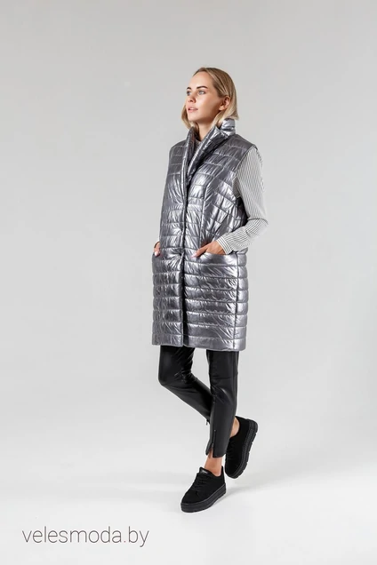 Жилет прямого силуэта из плащевой ткани с наполнителем HOOPON 150 г/м2, на подкладке. По переду горизонтальный подрез с карманом во шве, нагрудная вытачка, по спинке – горизонтальный подрез. Изделие со стояче-отложным воротником и отложным лацканом. Застежка по центру переда на три сквозных кнопки. Длина изделия по спинке/ Длина изделия по переду/ Длина рукава, см 42-44 р-р 46-50 р-р 52-56 р-р 58-62 р-р 88/-/- 90/-/- 92/-/- 94/-/-