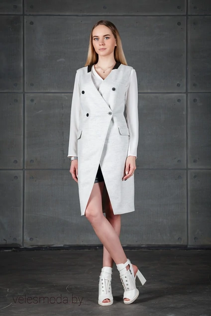 Жилет из палтовой ткани на подкладке прилегающего силуэта, отрезное по линии талии. Застежка двубортная с косыми линиями борта, застегивается на две петли и две пуговицы, 2 другие пуговицы декоративные. По переду талиевые вытачки, прорезной карман с клапаном и одна декоративная листочка на лифе с левой стороны. Особенной отделкой служит стойка из кожи контрастного цвета и отделочные строчки.