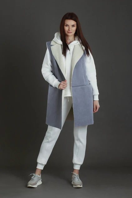 Жилет прямого силуэта из "дублёнки". Перед с вертикальной нагрудной вытачкой и горизонтальным подрезом, и удобным карманом во шве. Спинка с декоративным центральным швом и тоже с горизонтальным подрезом. Воротник стойка с отворотом. Изделие без застёжки.
