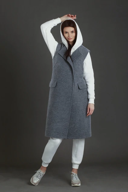 Изделие прямого кроя из пальтовой ткани на подкладке. По переду наклонные нагрудные вытачки и прорезные карманы с листочкой и клапаном. Спинка со средним швом. Застежка жилета двубортная по переду на две потайные пришивные кнопки.