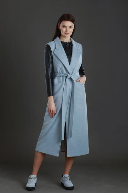 Жилет длинный из пальтовой ткани, на подкладке прямого силуэта. По переду рельефы, идущие в подрезы с потайным карманом. Спинка с центральным швом и высокой шлицей, с горизонтальным подрезом. Воротник с фигурным лацканом. Застежка по центру переда на одну потайную кнопку пришивную и на съемный широкий пояс.