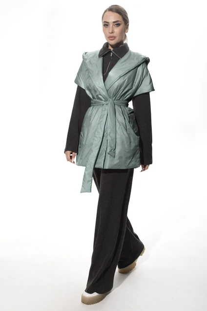Жилет утепленный прямого силуэта в стиле оверсайз, без застежки, со съемным поясом и капюшоном. Полочки и спинка цельные, в боковых швах расположены карманы.