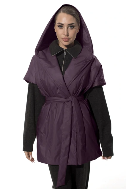 Жилет утепленный прямого силуэта в стиле оверсайз, без застежки, со съемным поясом и капюшоном. Полочки и спинка цельные, в боковых швах расположены карманы.