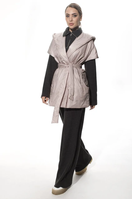 Жилет утепленный прямого силуэта в стиле оверсайз, без застежки, со съемным поясом и капюшоном. Полочки и спинка цельные, в боковых швах расположены карманы.