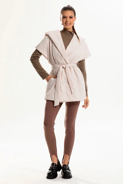 Жилет утепленный прямого силуэта в стиле оверсайз, без застежки, со съемным поясом и капюшоном. Полочки и спинка цельные, в боковых швах расположены карманы.