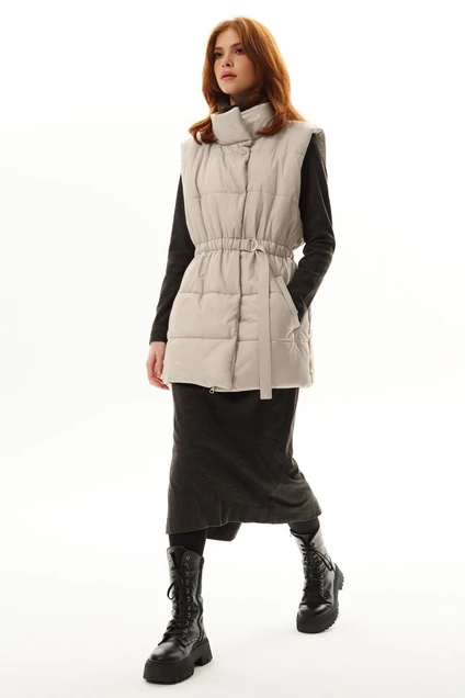 Жилет утепленный прямого силуэта с центральной застежкой на молнию и кнопки. На уровне бедер расположены прорезные карманы с листочками По талии- кулиса с пояском и резинкой.
