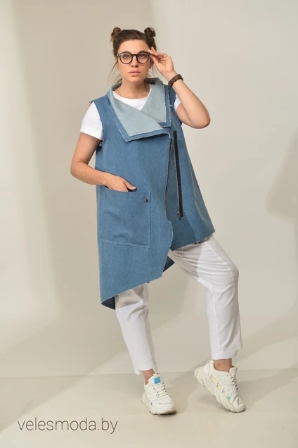 Жилет джинсовый удлиненный, свободный,прямого силуэта с одним боковым швом. Застежка ассиметричная на молнии. Воротник "апаш"мягкой формы. Линия низа фигурная и ассиметричная. На все швы и края настрочены накладные полоски из основной ткани с необработанными краями. На правой половинке переда накладной свободный карман.