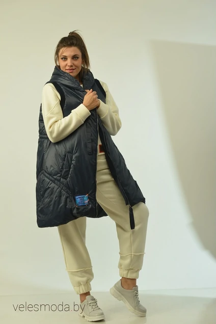 Жилет женский из плащевой ткани  длинный с фигурным низом спереди выше сзади ниже линии колена. С капюшоном, застежка на молнии. На полочках прорезные карманы с листочкой. Пройма спереди обработана трикотажными довязами. По переду, спинке и капюшону проходят кулисы с втягивающимися шнурками. Подкладка из вискозы контрастного цвета. Жилет объемный и  «воздушный» на синтетическом утеплителе Isosoft, который обладает теплоизолирующей способностью при практически неощутимом весе. Очень мягкий, пластичный, гипоаллергенный.  Дает ощущение комфорта.