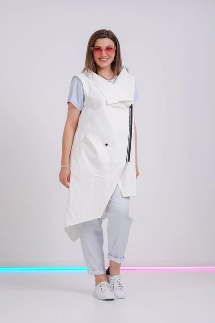 Жилет джинсовый удлиненный свободного кроя с одним боковым швом. Застежка ассиметричная на молнии. Воротник "апаш" мягкой формы. Линия низа фигурная и ассиметричная. На все швы и края настрочены накладные полоски из основной ткани с необработанными краями. На правой половинке переда накладной свободный карман.