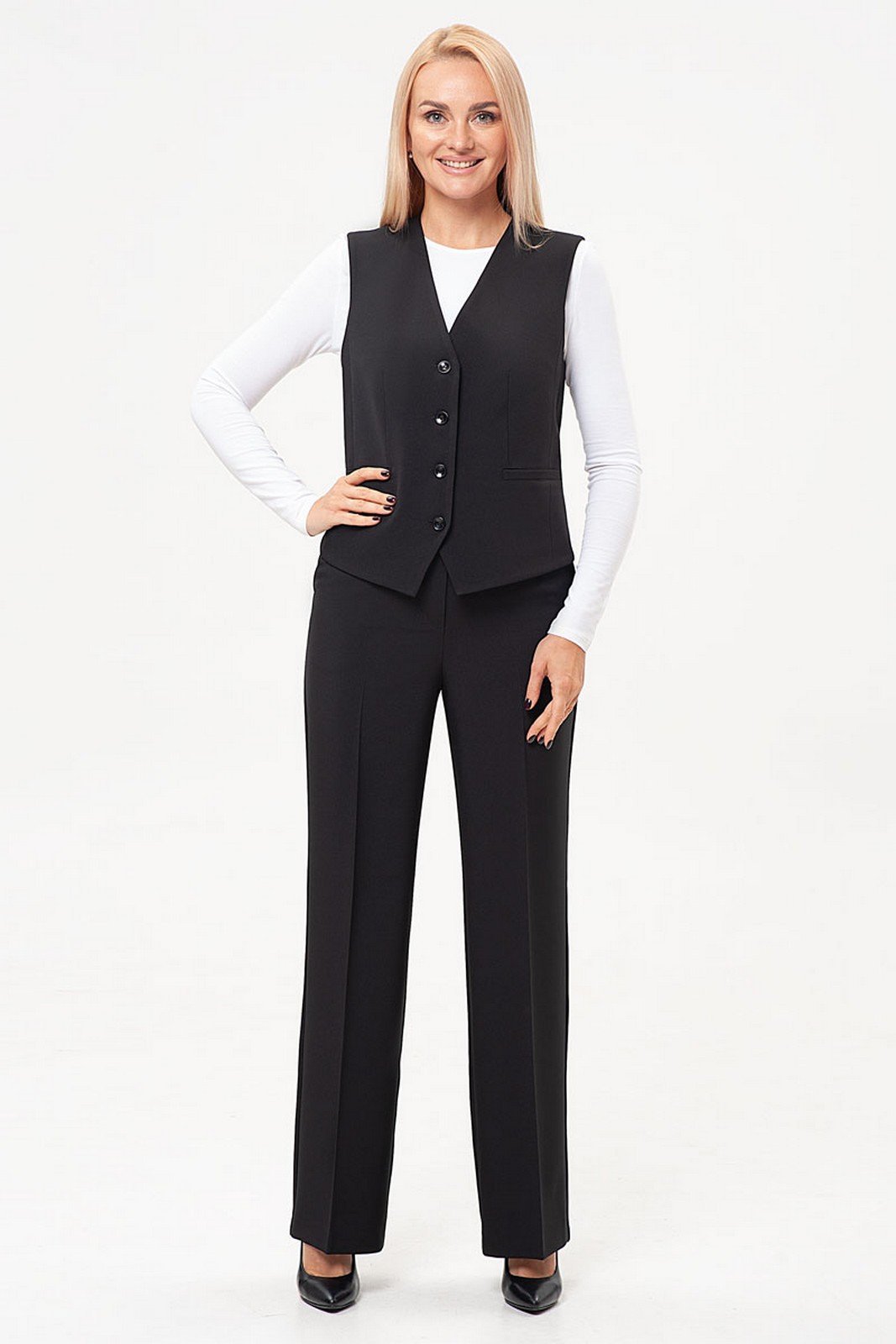 Элегантный женский жилет в классическом черном цвете. Модель выполнена из качественного материала, который идеально подчеркивает фигуру благодаря приталенному силуэту. Укороченный дизайн дополнен однобортной застежкой на пуговицы, добавляя изысканности в образ. Жилет украшен V-образным вырезом горловины и оригинальными фигурными срезами по низу полочек. Спереди расположены удобные горизонтальные карманы с листочкой для акцента на структурности. Задняя часть модели оформлена средним швом. Подкладка обеспечивает дополнительный комфорт при носке. Этот женский жилет станет идеальным выбором для создания респектабельных и стильных бизнес-луков.