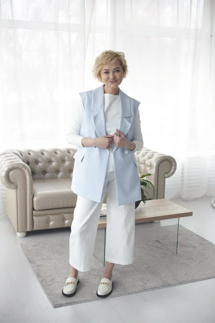 Перед цельнокроеный с нижним воротником, с двубортной застежкой на 2 петли и 2 пуговицы с обтачным подбортом, с прорезными карманами с клапаном.Спинка со средним швом, с вытачками от плечевого шва. Подкладка переда с нагрудной складкой.Подкладка спинки со средним швом, вверху со складкой по шву притачивания обтачки горловины спинки. Менять образы легко, комбинируя жилет с платьями, брюкамии блузками, джинсамии и футболками.