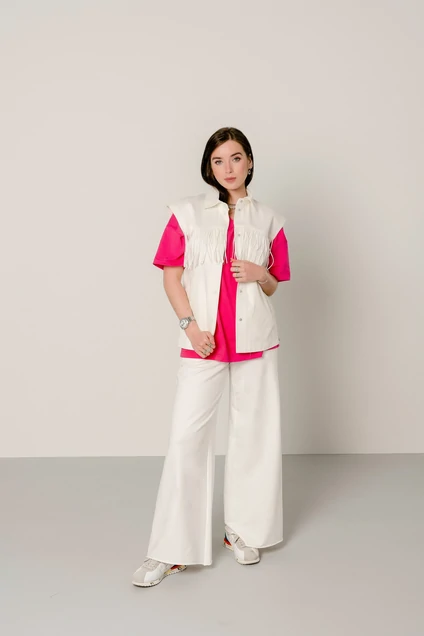 Жилет молодежный из плотного хлопка, прямого силуэта, центральная застежка на кнопки в цвет джинса по переду,со спущенной линией плеча,с воротником,декоративной бахромой по линии фигурной кокетки,и разрезами по низу в боковых швах. Длина 63см. ширина по линии груди 51,5,53,5 55,57,5см. (42,44,46,48рр) ,ширина по талии 49,5 51,5 53,5 55,5см(42,44,46,48рр) , ширина на уровне бедер 50,5,52,5 54,5 56,5см соответственно.
