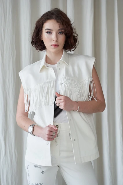 Жилет молодежный из плотного хлопка, прямого силуэта, центральная застежка на кнопки в цвет джинса по переду,со спущенной линией плеча,с воротником,декоративной бахромой по линии фигурной кокетки,и разрезами по низу в боковых швах. Длина 63см. ширина по линии груди 51,5,53,5 55,57,5см. (42,44,46,48рр) ,ширина по талии 49,5 51,5 53,5 55,5см(42,44,46,48рр) , ширина на уровне бедер 50,5,52,5 54,5 56,5см соответственно.
