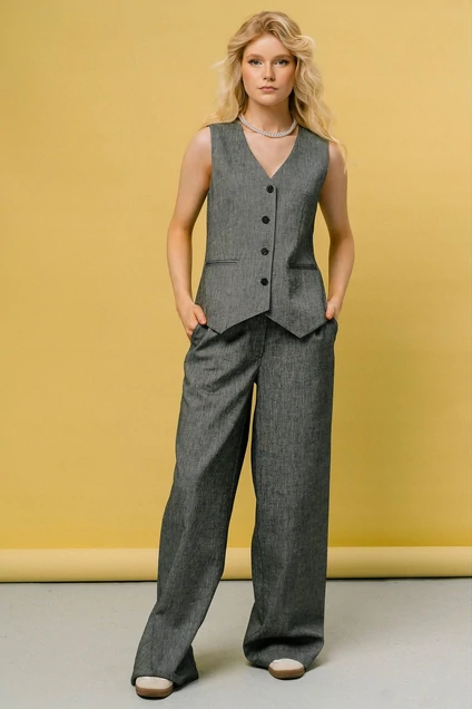 Женский жилет полуприлегающего силуэта, выполненный из льняной ткани и оснащенный подкладкой для дополнительного комфорта. Жилет имеет центральную застежку по переду на 5 петель и пуговиц, что обеспечивает удобство и стиль. Карманы по переду выполнены в рамку, добавляя изысканность и функциональность. V-образная горловина без воротника придает жилету современный и элегантный вид. Спинка жилета имеет средний шов для лучшей посадки. Длина изделия составляет 52 см, что делает его отличным выбором для создания стильного многослойного образа.