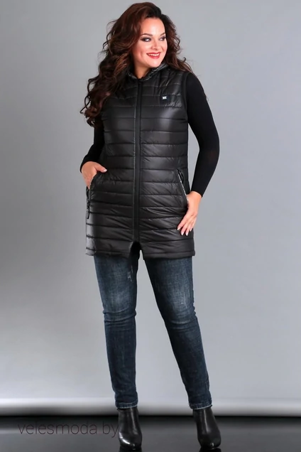 Жилет прямого силуэта из стеганной ткани с капюшоном. Застежка на тесьму молнию, карманы с магнитами. По проймам довязы. На левой полочке нашивка. Жилет на подкладке. Рекомендуется носить на теплый свитер, по верх куртки, пальто. Возможно применение иных элементов декора, не меняющих общий вид изделия. Длина жилета по спинке – 77 см.