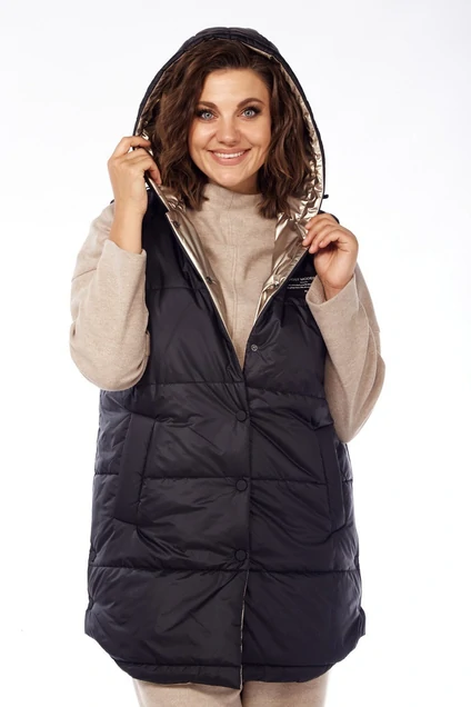 Жилет женский изготовлен из стеганой курточной ткани на синтепоне. Горловина оформлена капюшоном, с кулисой и втянутым шнуром с фиксатором. По переду обработаны карманы с листочками. Спинка цельнокроеная. Застежка на кнопки. Низ в изделии фигурный.В боковых швах по низу обработаны шлицы с кнопками. Декором служит нашивка на левой полочке.