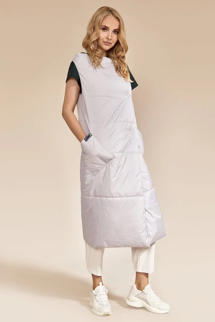 Жилет прямого силуэта с застежкой на запах на пришивные кнопки. Перед со спинкой цельнокроеные. Спинка со средним швом. По переду расположены накладные карманы. На спинке и правом кармане расположены декоративные пришивные элементы. Жилет утеплительным полотном ISOSOFT. Длина 110 см.