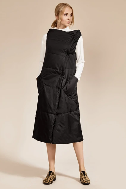 Жилет прямого силуэта с застежкой на запах на пришивные кнопки. Перед со спинкой цельнокроеные. Спинка со средним швом. По переду расположены накладные карманы. На спинке и правом кармане расположены декоративные пришивные элементы. Жилет утеплительным полотном ISOSOFT. Длина 110 см.