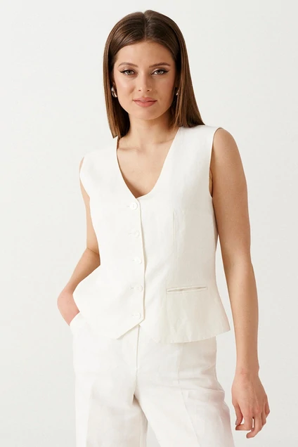 Жилет женский выполнен из льняной ткани. Характеристики: прилегающий силуэт, застежка фронтальная на пуговицы. По переду прорезные карманы в рамку. Спинка со средним швом.