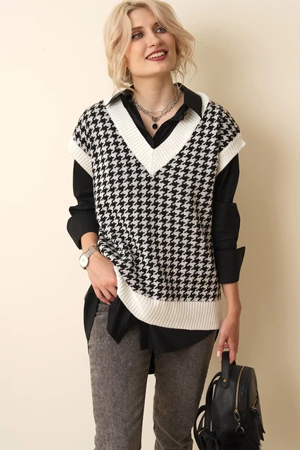 Жилет прямого силуэта с V-образным вырезом горловины. Жилет прекрасно сочетается с черной и белой рубашкой. А модный дизайн - «гусиная лапка» придаст вашему гардеробу яркий акцент и будет притягивать к вам взгляды окружающих. Наряд создан для тех, кто знает как выглядеть неотразимо и при этом чувствовать себя комфортно.