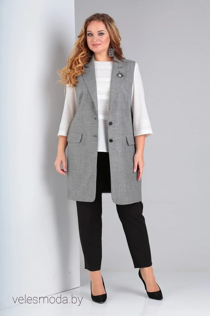 Жилет полуприлегающего силуэта с центральной застежкой на петли и пуговицы. Перед с прорезными карманами и клапаном. Воротник пиджачного типа с округлыми концами воротника и лацкана. Дополнительным украшением является брошь. Жилет на подкладке.