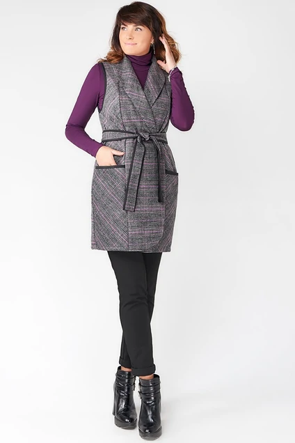 Жилет с воротником типа "шаль", Внутренние боковые карманы. Проймы и верхний срез кармана обработаны гладкой тканью. Двусторонний съемный пояс из основной ткани с одной стороны и с другой обработан гладкой тканью в тон обработки проймы и верхнего среза кармана. Выполнен из мягкого теплого текастиля в клетку.