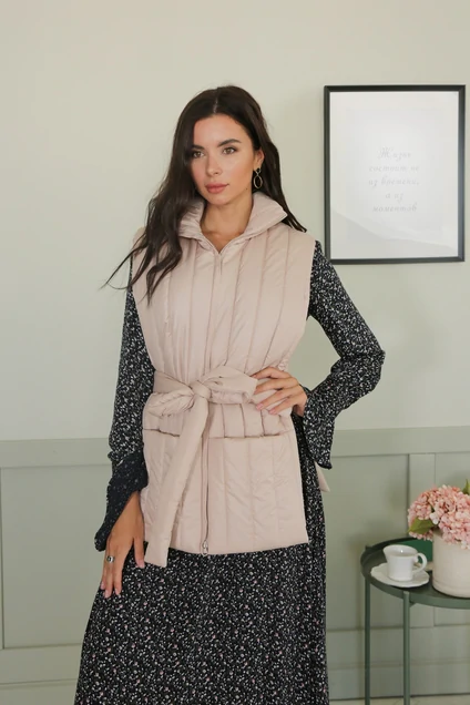 Жилет женский из стеганной плащевой ткани. Застежка по полочке, центральная на молнию. Воротник -стойка.