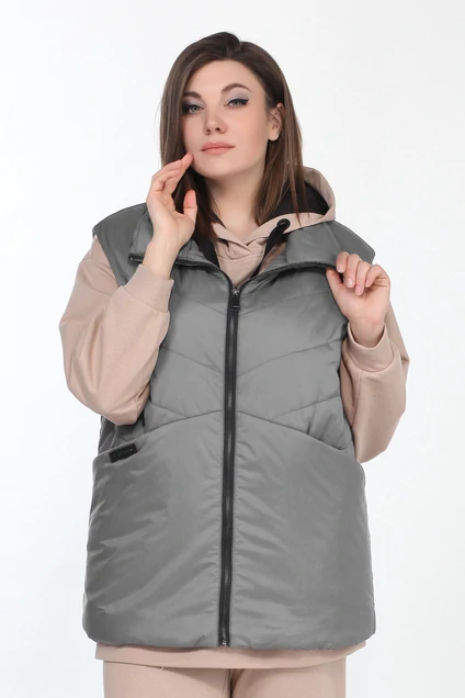 Жилет с отстегивающимся капюшоном и воротником стойка, из курточной ткани “ЛАКЕ”, уникальный бельгийский утеплитель «ISOSOFT» 100 г. на метр кв. и ветрозащитной мембранной подкладки «Barrier». По полочке декоративная стежка, в фигурном подрезе внутренние карманы. Застежка молния. Низ жилетки на регулируемой кулиске. Длина по спинке 75 см.
