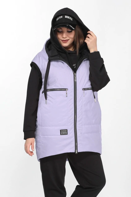 Жилет свободного силуэта с капюшоном на стойке из водоотталкивающей ткани “ЛАКЕ”, уникальный бельгийский утеплитель «ISOSOFT» 100 г. на метр кв. и ветрозащитной мембранной подкладки «Barrier». По полочкам два функциональных нагрудных кармана с декоративными от строчками и молниями, в рельефах так же имеются прорезные карманы с листочками. Низ жилета при собран на эластичную тесьму. Застежка декор. молния. Длина по спинке 87 см.
