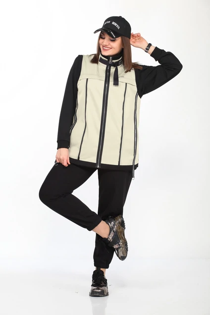 Жилет из плащевой ткани без подкладки на молнии. Спинка, полочка на кокетке и декоративной складкой, по рельефам отделочные ленты. Воротник, пройма, низ жилета - трикотажный довяз.