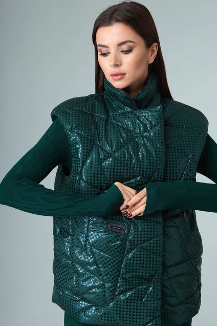 Жилет свободного силуэта на стёганом синтепоне из непромокаемой плащёвки. Воротник комбинированый. Застежка на потайные кнопки, по бокам накладные карманы. В качестве дополнения предлагается пояс.