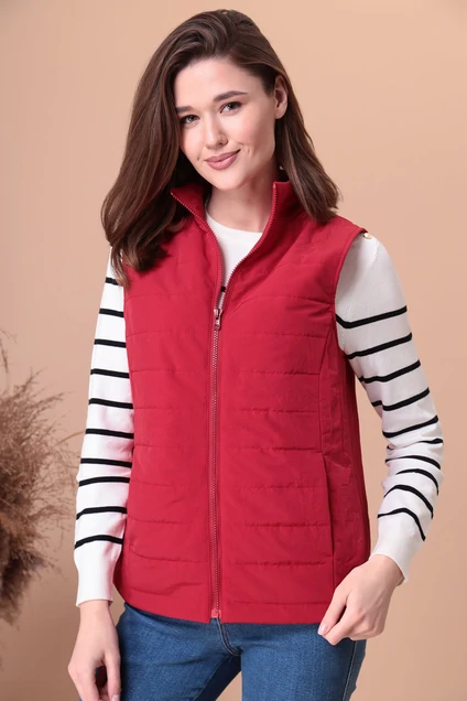 Стеганый жилет -- универсальная вещь в любом гардеробе. Он практичный и удобный. Жилет простёган с синтепоном, на подкладке, прямого силуэта, с бочками, карманами по переду и застежкой на молнию. Воротник стойка. Низ жилета фигурный закругленный. Длина спинки -- 62см. ПОГ:46р-52,5см, 48р-54,5см, 50р-56,5см. ПОБ:46р-55см, 48р-57см, 50р-59см.