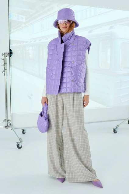 Жилет на стёганном синтепоне из непромокаемой плащевки. Воротник-стойка, застёжка глубокая до верху на потайные кнопки, по бокам накладные карманы.