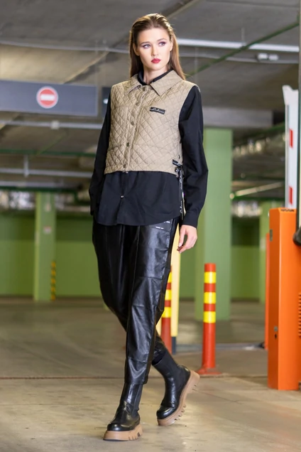 Комплект женский(жилет и рубашка).Жилет прямого силуэта актуального кроя на кнопках с накладными крманами,отложным воротником,декоративными кнопками и лентами по бокам. Рубашка прямого силуэта с фигурным низом, застёжкой на кнопки,по переду и спинке-кокетки. Жилет:длина по спинке -46 см Рубашка:длина по спинке -80см