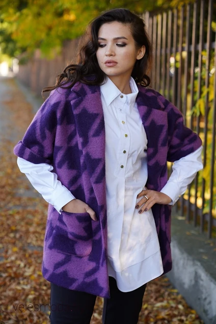 Жилет женский из пальтовой ткани свободного силуэта, на подкладке, без застежки. Воротник пиджачного типа с отложными лацканами. Перед с накладными карманами. Рукав цельнокроенный короткий с отворотом, имитирующим манжет. Длина изделия: 77 см